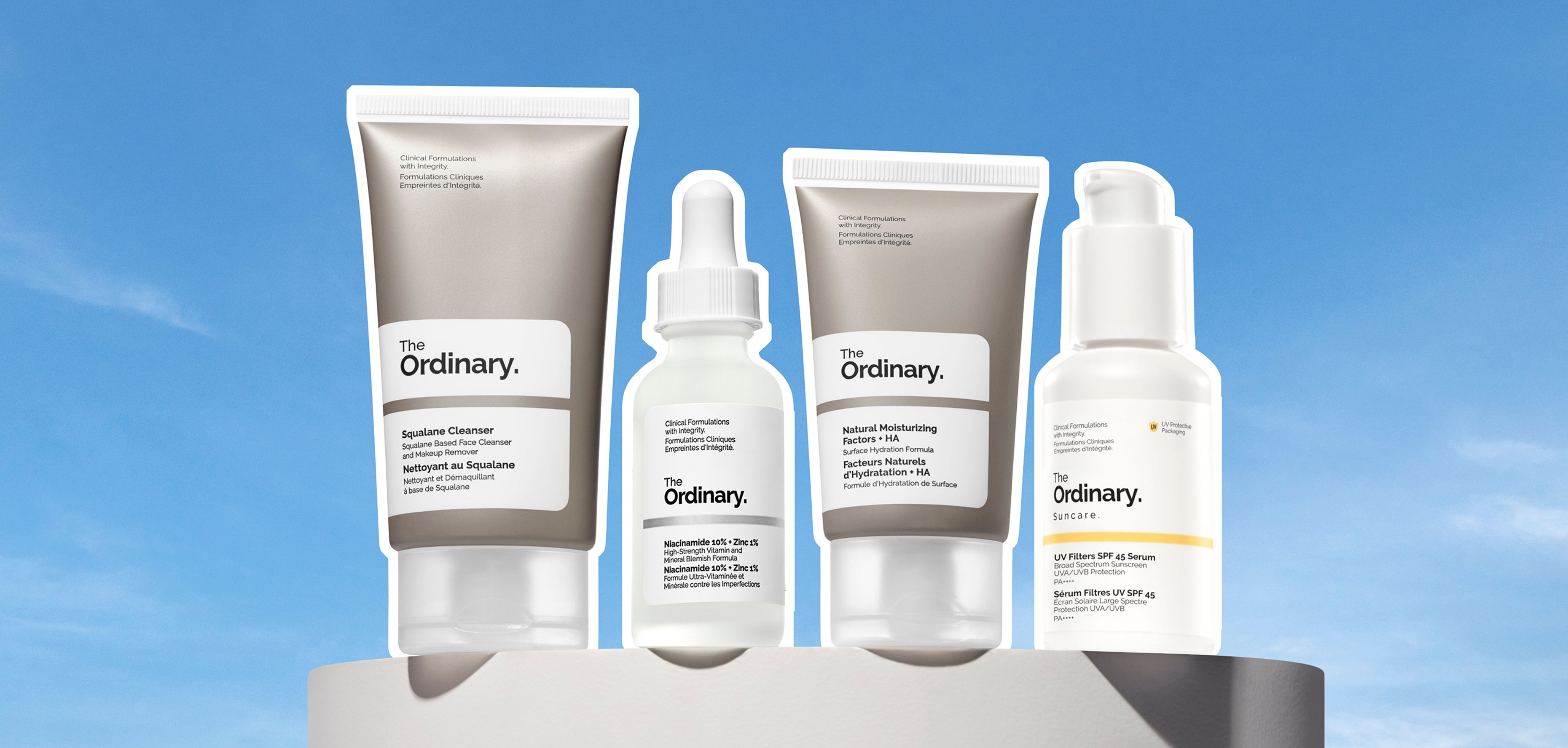Three The Ordinary skincare products on a white surface: Squalane Cleanser in a tube, Multi-Peptide + HA Serum in a dropper bottle, and Natural Moisturizing Factors + HA in a tube with a swatch of cream.